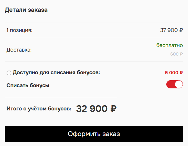 Реализовали начисление бонусных баллов за регистрацию и совершение покупок в интернет-магазине. Бонусы можно списать за последующие покупки в рамере 20% от общей стоимости заказа. Бонусный счет выводится в шапке сайта, в личном кабинете доступна информация о сроке использования баллов.