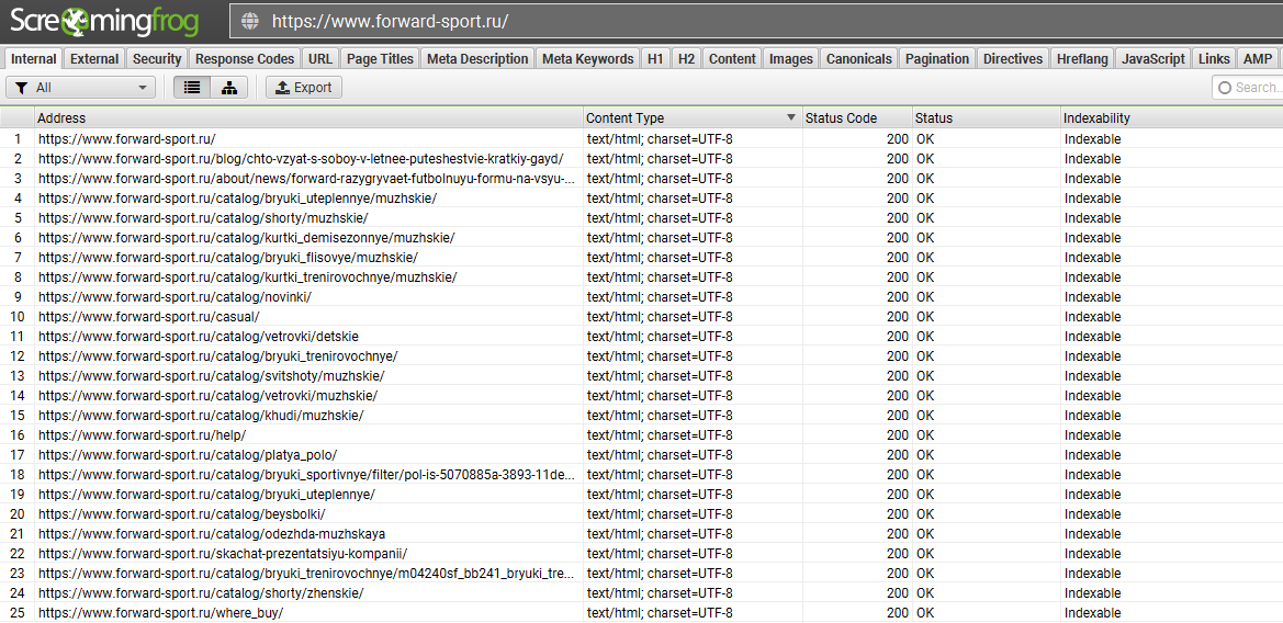 При редизайне сайта стояла задача сохранить накопленный SEO-потенциал проекта, не допустив просадки позиций и трафика из поисковых систем. С помощью программы Screaming Frog выгрузили все страницы сайта и собрали мета данные, которые мы успешно перенесли на новый проект. При смене URL на новом проекте настроили редиректы со старых страниц на новые. Также проводились дополнительные выгрузки проиндексированных страниц из Яндекс.Вебмастера и Google.Searchconsole.