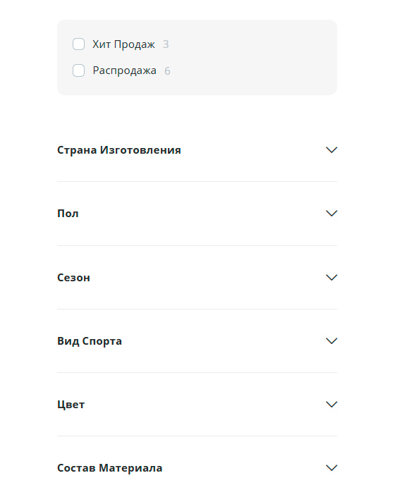 Для быстрой навигации по каталогу предусмотрено всплывающее меню, позволяющее мгновенно перейти в нужную категорию. Фиксированное верхнее меню всегда доступно, даже при прокрутке страницы. В нем удобно расположены тэги с тематическими подборками (например, для бега, футбола или специализированного снаряжения), а также ссылки на разделы, посвященные различным коллаборациям.