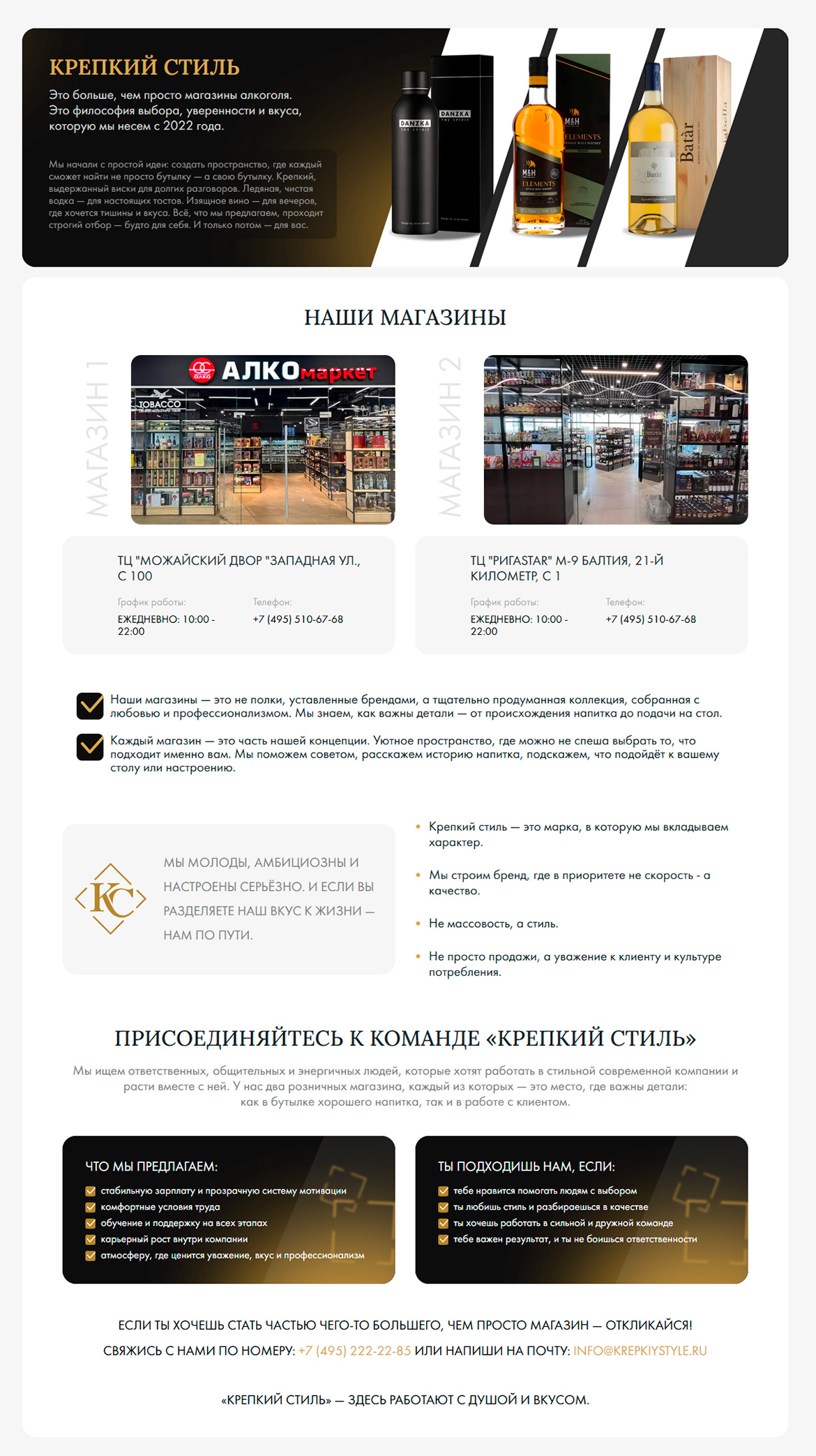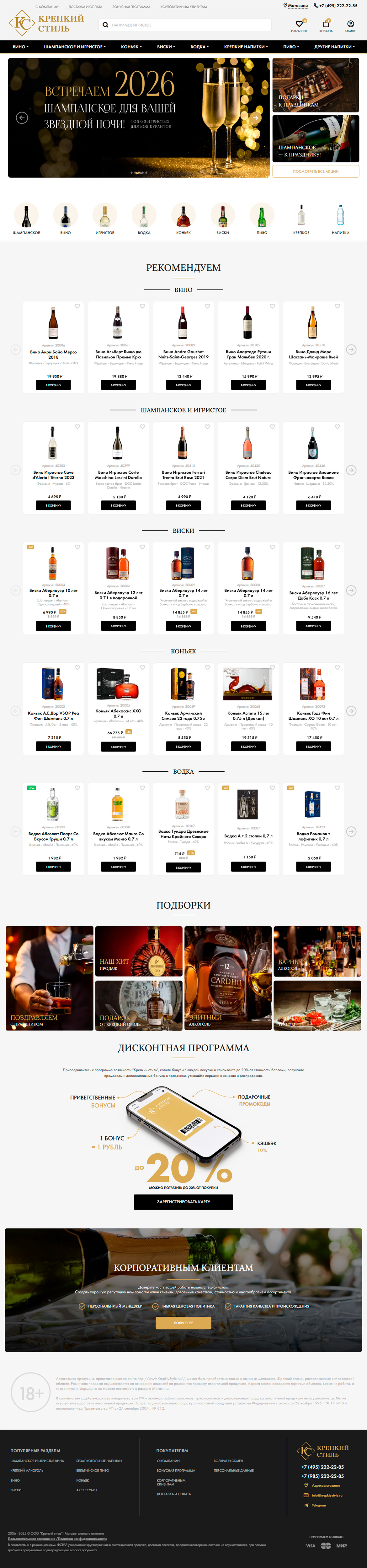 Интернет-магазин «Крепкий Стиль» предлагает большой выбор премиального алкоголя, включая вина, виски, коньяки и шампанское. Компания была основана в 2022 году, в настоящий момент работают 2 офлайн магазина.