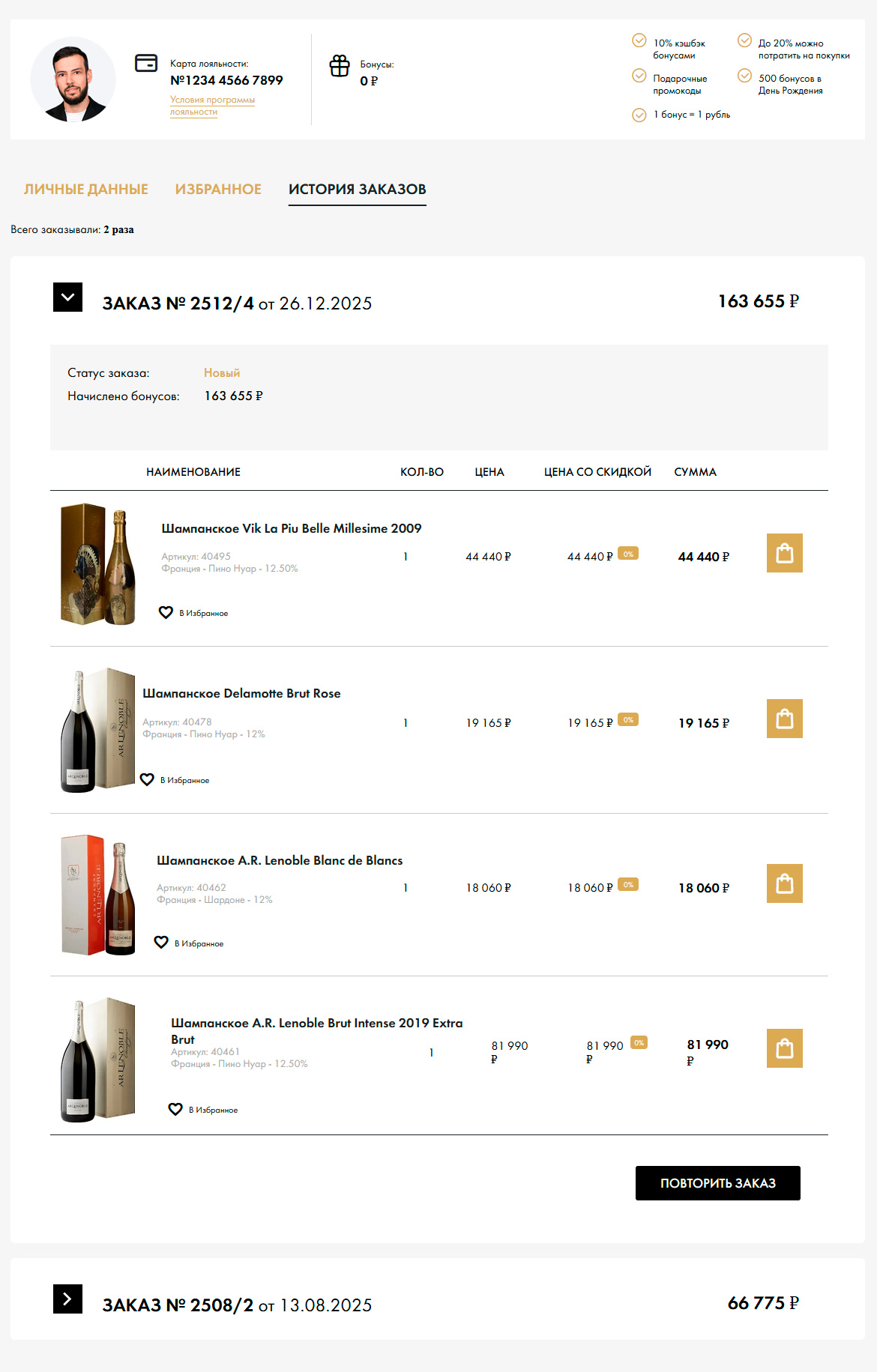В личном кабинете пользователь может посмотреть всю историю заказов, совершить повторную покупку, посмотреть свой бонусный счет, избранные товары и личную информацию.