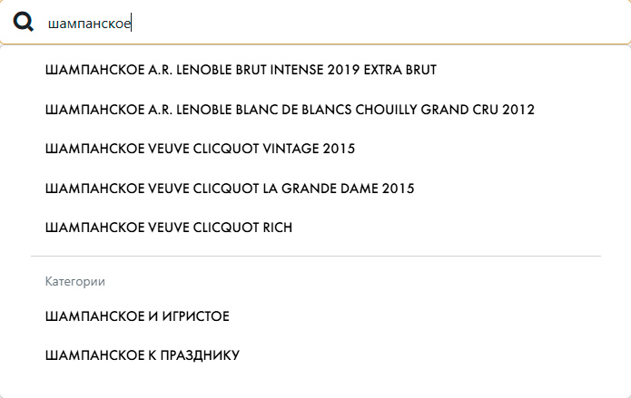 Поиск по сайту работает одновременно с продукцией и категориям товаров. При вводе первых символов появляются всплывающие подсказки с автоподстановкой результатов.