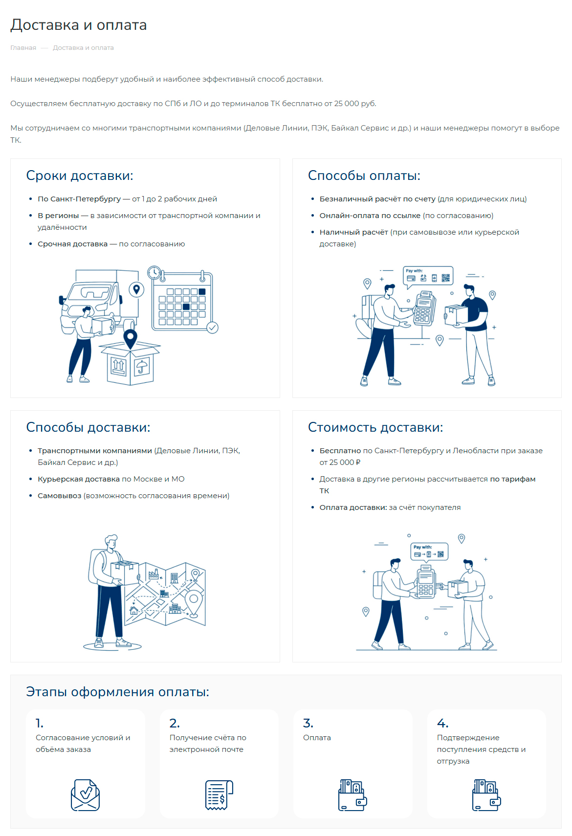 Разработали дизайн внутренних сервисных страниц «Доставка и оплата», «Производство», «О компании» для повышения лояльности посетителей сайта.
