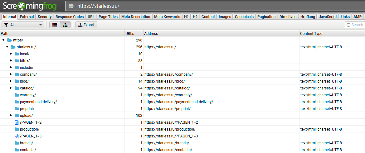 На скриншоте ниже изображена карта старого сайта, собранная через программу ScreamingFrog. Для всех страниц, изменивших свой URL, были настроены редиректы.