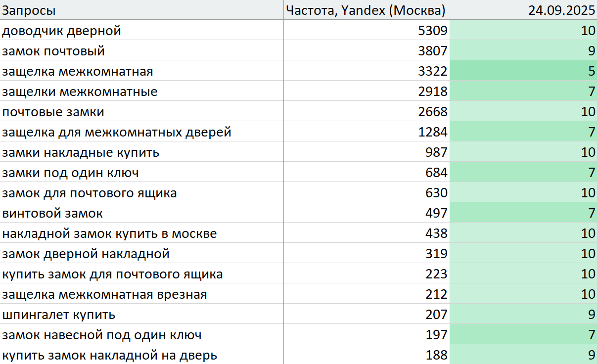 Вывели высокочастотные и среднечастотные фразы в ТОП-10. На скриншоте ниже выгрузка позиций сайта по ключевым запросам в Яндексе из системы Топвизор.