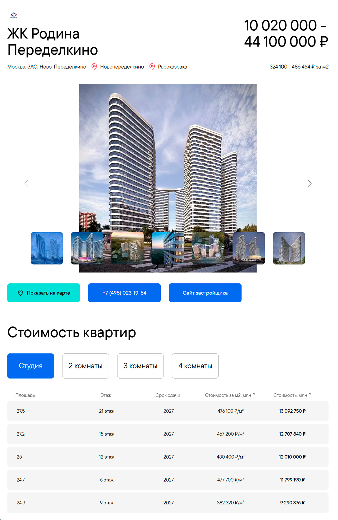 На внутренней странице ЖК функционирует интерактивная фотогалерея и каталог свободных к продаже квартир. Данные по квартирам обновляются каждый день с помощью парсинга сайтов застройщиков, исходя из этого пользователи портала получают актуальную информацию.