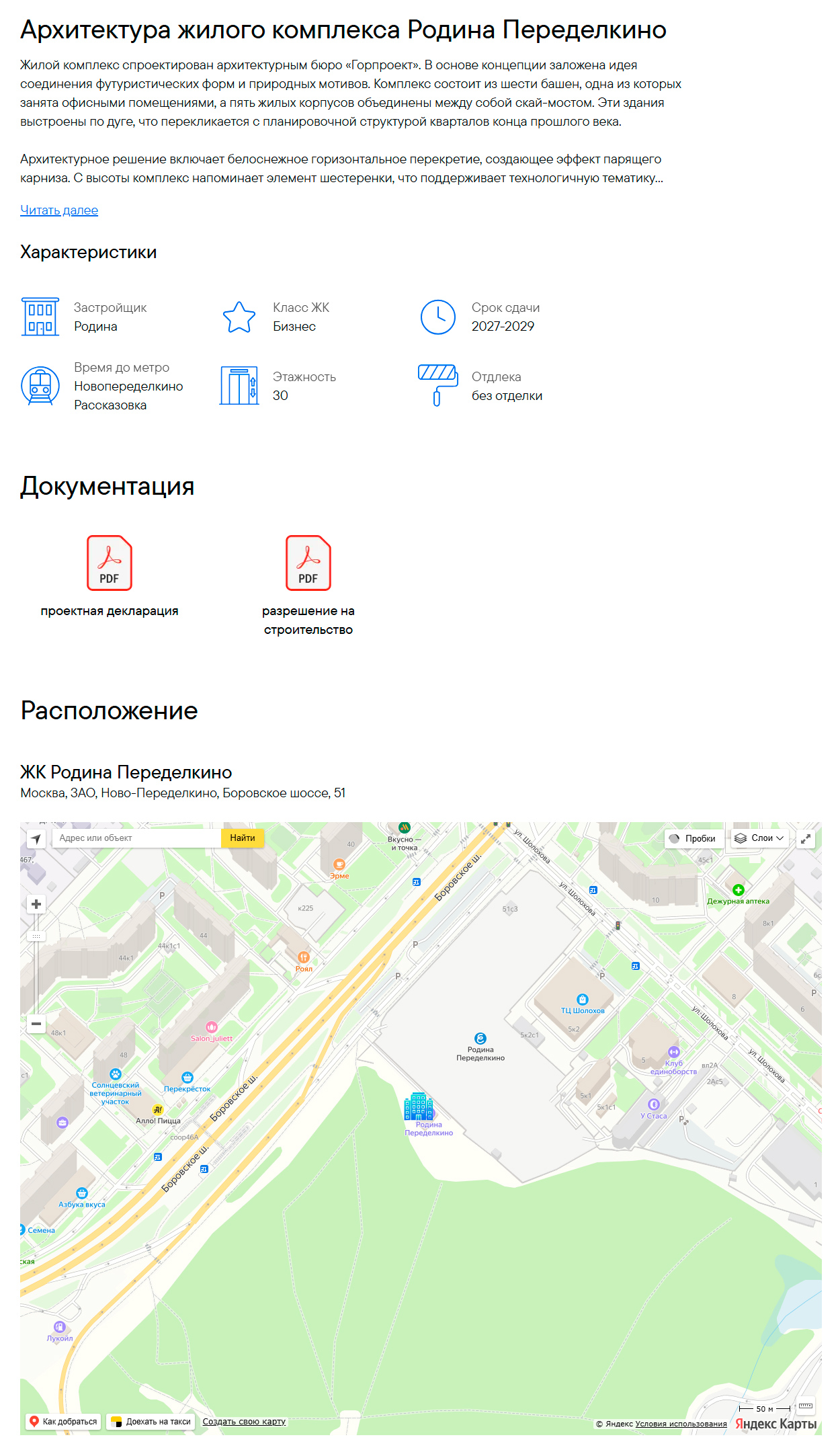 На странице ЖК посетители могут ознакомиться с описанием, скачать файлы с документацией и посмотреть контактные данные с интерактивной Яндекс картой.