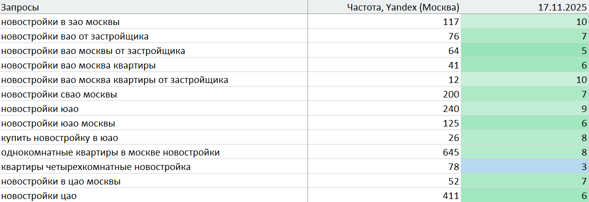 Ниже предоставлена выгрузка из программы Топвизор по некоторым среднечастотным запросам