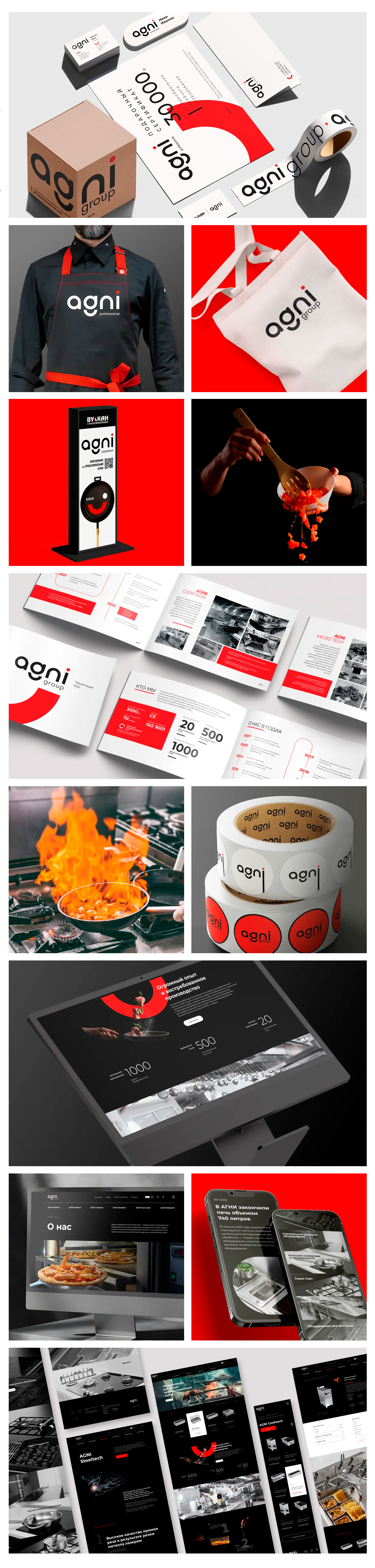Для AGNI разработан целостный визуальный образ, отражающий энергию, технологичность и амбиции бренда. В основе фирменного стиля — контрастное сочетание чёрного, белого и ярко-красного, символизирующее огонь, движение и силу.
